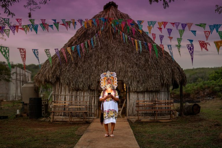 La serie articula preguntas urgentes sobre los efectos multidimensionales de la globalización tecnológica en las culturas originarias, sin recurrir a narrativas nostálgicas, esencialismos estratégicos o prácticas extractivistas. Desde la aproximación crítica del término «hiperconexión», la artista describe una de las paradojas más inquietantes de nuestra época: vivimos en la era de mayor conectividad tecnológica de la historia humana y, simultáneamente, experimentamos niveles sin precedentes de aislamiento individual y fragmentación comunitaria. En el paisaje yucateco actual, las torres de telecomunicaciones emergen junto a las ceibas sagradas (árboles cosmogónicos en la mitología maya), creando una geografía donde lo ancestral y lo hipermoderno coexisten en una tensión creativa que el proyecto documenta y problematiza. Esta distinción conceptual resulta fundamental para comprender la profundidad del proyecto. Los rituales mayas tradicionales (desde el ch’a’ cháak o ceremonia de petición de lluvia hasta las celebraciones patronales) funcionaban históricamente como sofisticadas tecnologías sociales. Estos eventos ceremoniales cumplían funciones espirituales o religiosas, mientras tejían redes de reciprocidad, reforzaban identidades colectivas transgeneracionales y transmitían conocimientos esenciales para la supervivencia comunitaria y la reproducción cultural. En contraste, las plataformas digitales contemporáneas, pese a su promesa retórica de conexión universal y democratización comunicativa, frecuentemente producen experiencias de consumo individualizado, efímero y descontextualizado que erosionan los vínculos comunitarios.
