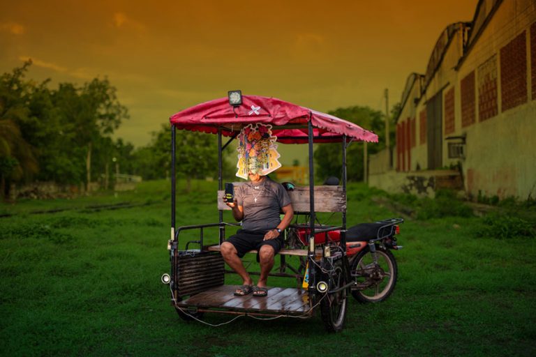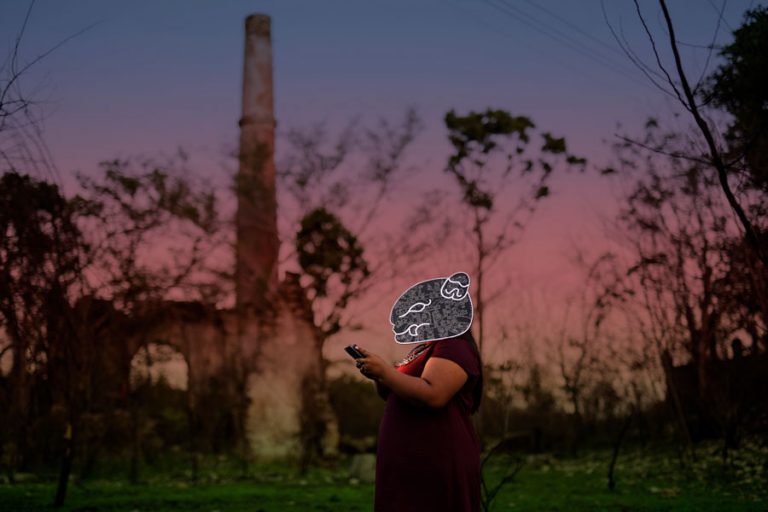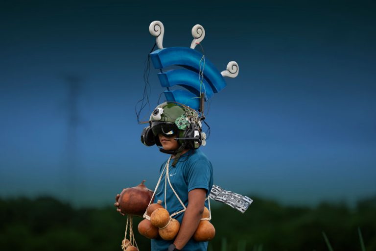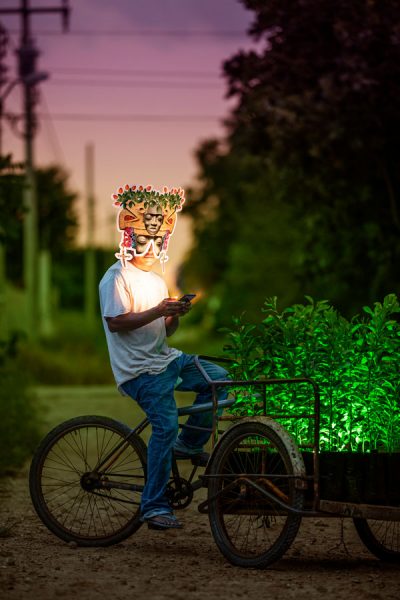 The series articulates urgent questions about the multidimensional effects of technological globalization on Indigenous cultures, without resorting to nostalgic narratives, strategic essentialisms, or extractivist practices. Through a critical approach to the term «hyperconnection,» the artist describes one of the most unsettling paradoxes of our era: we live in the age of the greatest technological connectivity in human history and, simultaneously, we experience unprecedented levels of individual isolation and community fragmentation. In the current Yucatecan landscape, telecommunications towers emerge alongside sacred ceiba trees (cosmogonic trees in Maya mythology), creating a geography where the ancestral and the hypermodern coexist in a creative tension that the project documents and problematizes.