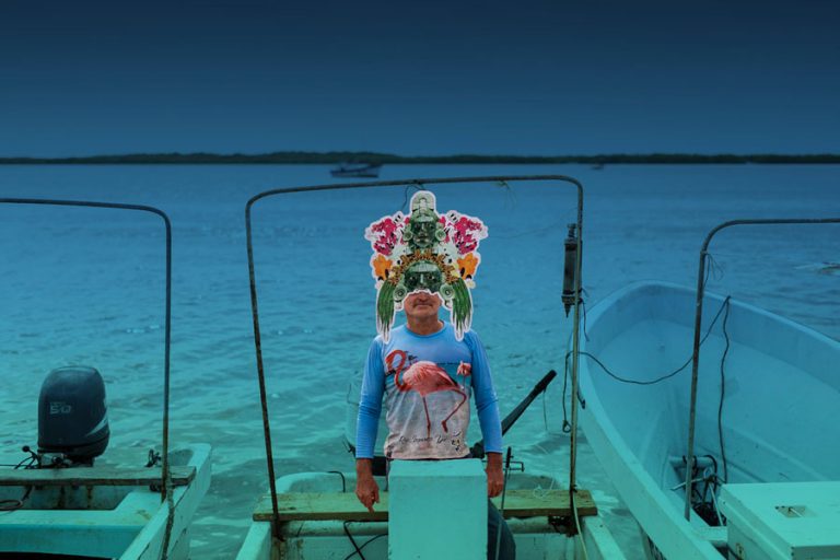 Entre estas intervenciones destacan las máscaras rituales recontextualizadas como interfaces simbólicas entre lo sagrado y lo digital. Tres creadores y colectivos contribuyeron con sus visiones particulares a este corpus de máscaras: Sofía Broid desarrolló piezas que surgieron de su memoria de la península y de las conversaciones con Sánchez Renero. Su trabajo evidencia la posición del observador externo que construye narrativas visuales desde la honestidad y responsabilidad de su propia extranjería. Donají Marcial abordó la complejidad del pensamiento maya mediante máscaras que representan cruces de iconografía para reimaginar cómo se verían las deidades con audífonos o qué pasaría en la astronomía ancestral si le agregamos los satélites que nos ayudan ahora a estar siempre conectados. En un tercer momento, el Colectivo Última Hora (conformado por Mónica Rosas Rojas, Joaquín Segundo, Ramón Espinosa y Jeremy Carvajal) creó cinco máscaras abordando temas relacionados con el lenguaje, la decadencia y cómo la tecnología nos ha ido absorbiendo. Aunque ninguno de sus miembros tiene raíces mayas específicamente, el colectivo aporta perspectivas de comunidades de otras regiones, enriqueciendo el diálogo intercultural del proyecto.