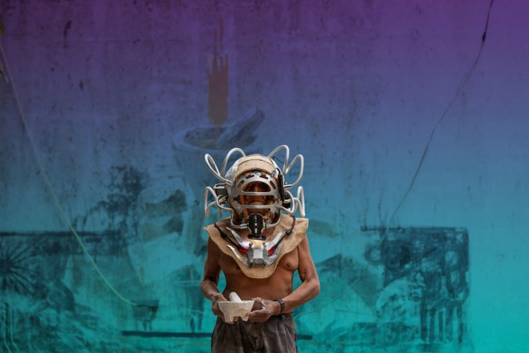 Three creators and collectives contributed their particular visions to this body of masks: Sofía Broid developed pieces that emerged from her memory of the peninsula and from conversations with Sánchez Renero. Her work makes evident the position of the external observer who constructs visual narratives from the honesty and responsibility of her own foreignness. Donají Marcial addressed the complexity of Maya thought through masks that represent iconographic crossings, reimagining what deities would look like with headphones or what would happen to ancestral astronomy if we added the satellites that now help us stay always connected. In a third instance, the Colectivo Última Hora (formed by Mónica Rosas Rojas, Joaquín Segundo, Ramón Espinosa, and Jeremy Carvajal) created five masks addressing themes related to language, decadence, and how technology has been absorbing us. Although none of its members have specific Maya roots, the collective contributes perspectives from communities in other regions, enriching the project’s intercultural dialogue.